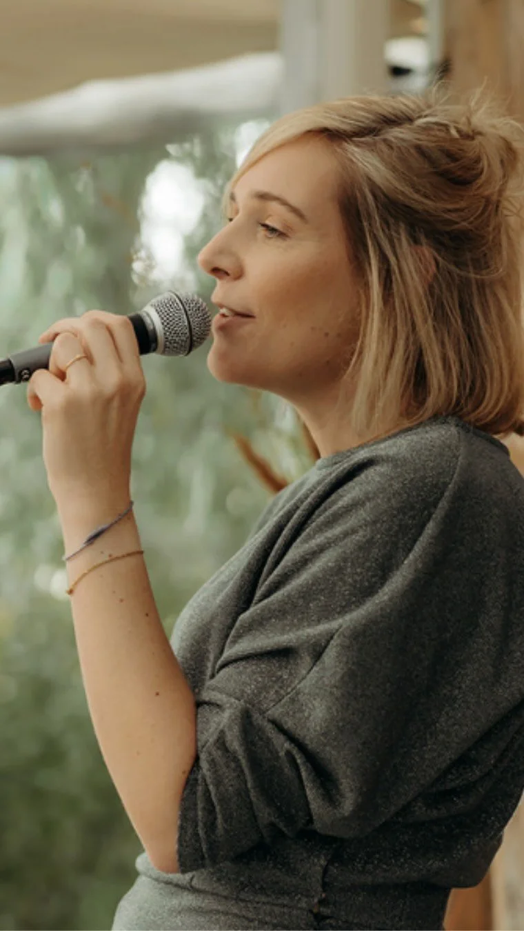 Ik zing in duo tijdens ceremonies en kan ook de receptie muzikaal begeleiden met een warme, licht swingende band. Altijd met dezelfde intentie: het moment dragen, ruimte laten voor wat gevoeld mag worden, en af en toe ook voor een zachte glimlach.